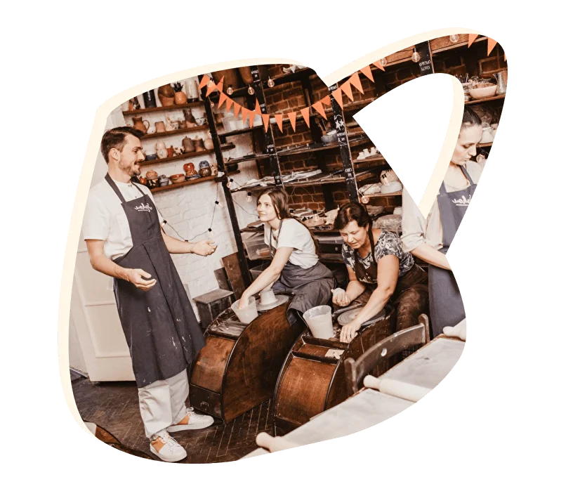 Создаёте все вместе кружки, тарелки или другие формы на гончарном круге или лепкой. Мастер уделяет внимание каждому.