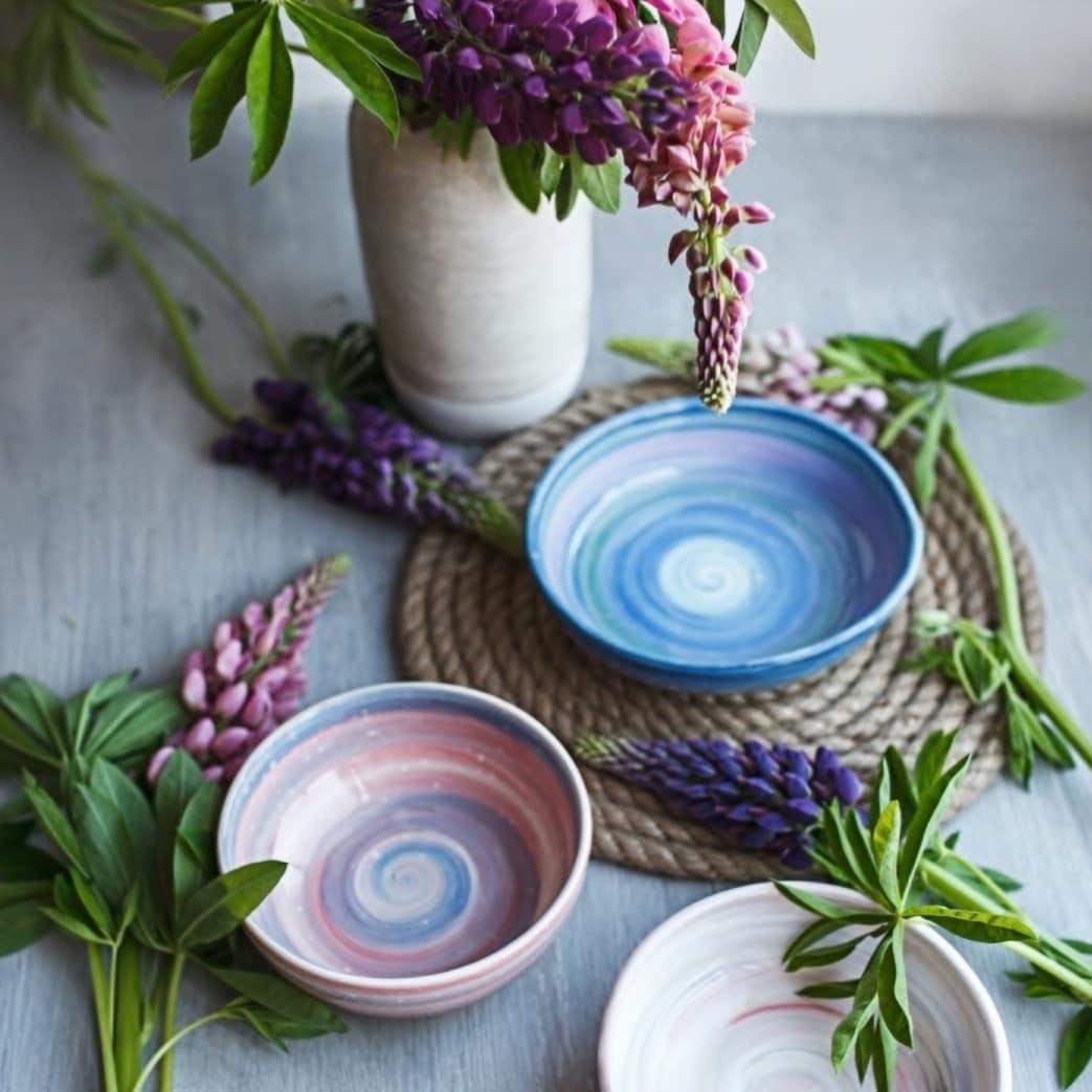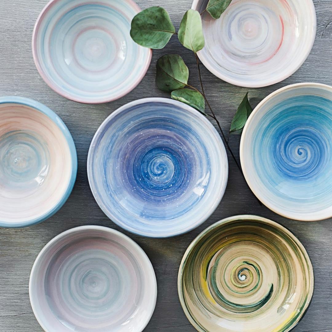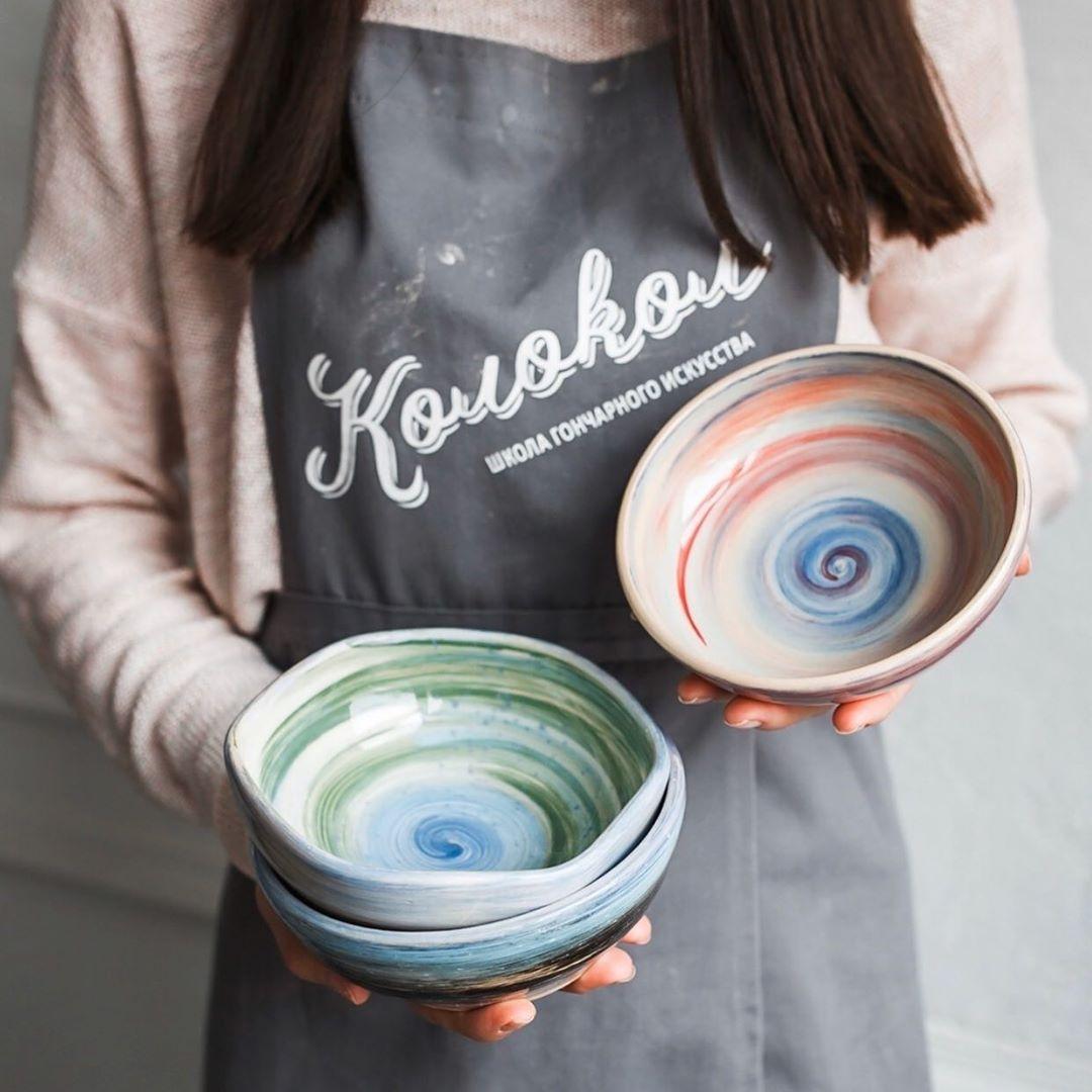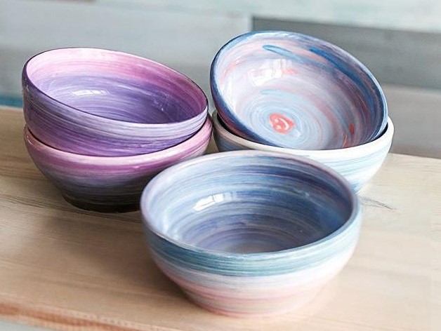 Ангобами можно расписывать, не снимая пиалу с гончарного круга! Кисточкой проводите от центра к краям и получаются невероятные цветные вихри!